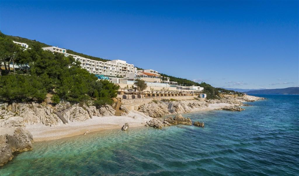 hotelový komplex • kaskádovitě klesá k moři • přístup po schodech • přírodní skalnatá pláž • upravené plochy na slunění • sprchy na pláži • lehátka a slunečníky za poplatek